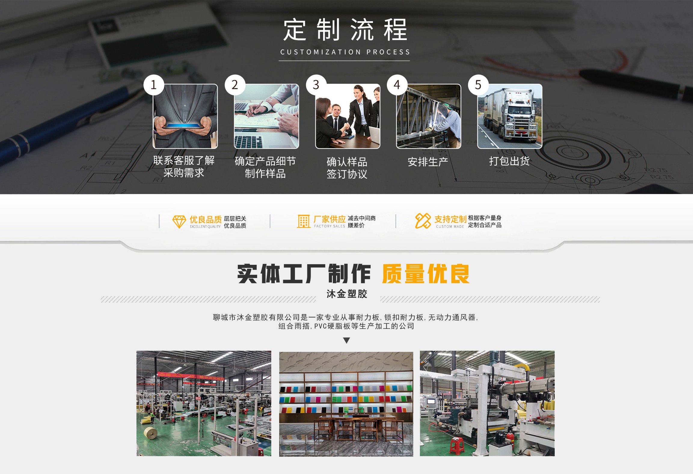 聊城市沐金塑膠有限公司注冊資金2180萬元,占地20000余平方,擁有自建廠房15000平方,員工100余名。10余年來,公司主營耐力板,鎖扣耐力板,耐力板深加工,無動力通風器,組合雨搭,PVC硬脂板,耐力板廠家等板材的發展戰略,逐漸成長為綜合性企業?! 」緭碛卸鄺l板材共擠生產線,采用世界知名品牌進口原材料和先進工藝,依據完善的ISO9001質量管理體系和ISO14001環境管理體系,為產品的卓越品質提供了強有力的保證。憑借過硬的創新能力和堅實的硬件基礎,贏創已成為國內領先的熱塑性板材生產商,產品被廣泛應用于建筑業、農業、工業、廣告業、安防行業及DIY領域?! 」臼冀K致力于通過提供最優的板材應用解決方案,為客戶創造最高的價值;堅守創新、質量、靈活、服務和速度的核心價值觀;堅持“完美的產品需要完美服務的支持”的經營理念,努力實現成為世界領先的板材與解決方案供應商的夢想。 在未來,公司將立足客戶需求,不斷改變和完善現有產品,拓展產品線和充分開發板材的應用領域,為客戶創造全方位的價值。同時更好地實現員工的價值,實現公司團隊的價值。我們將與您一起創贏未來! 企業使命:成為世界領先的板材與解決方案供應商?! 」驹妇埃和ㄟ^提供最優的板材應用解決方案,為客戶創造最高的價值。 核心價值觀:質量...